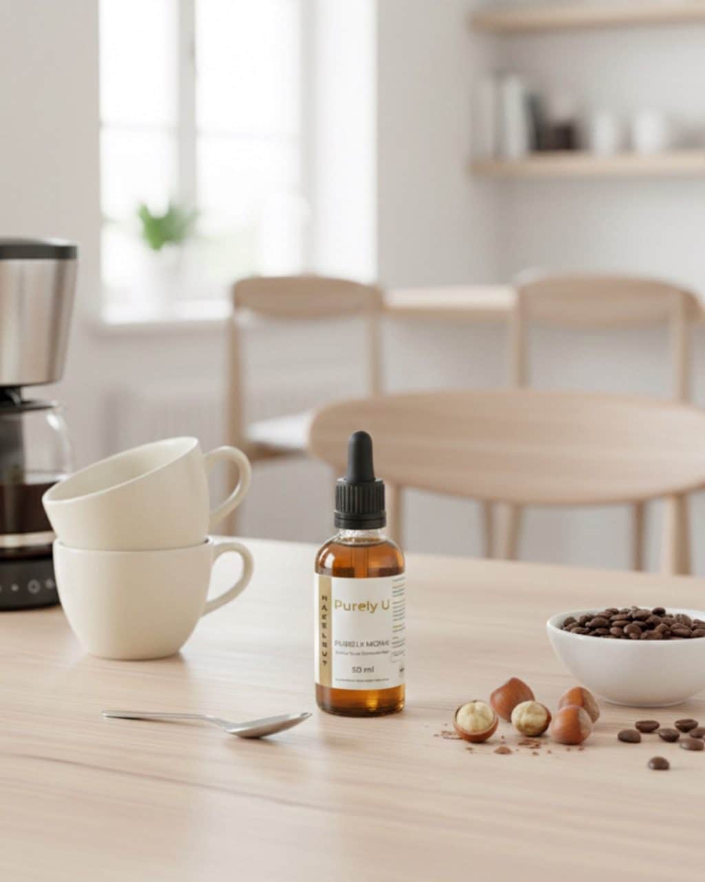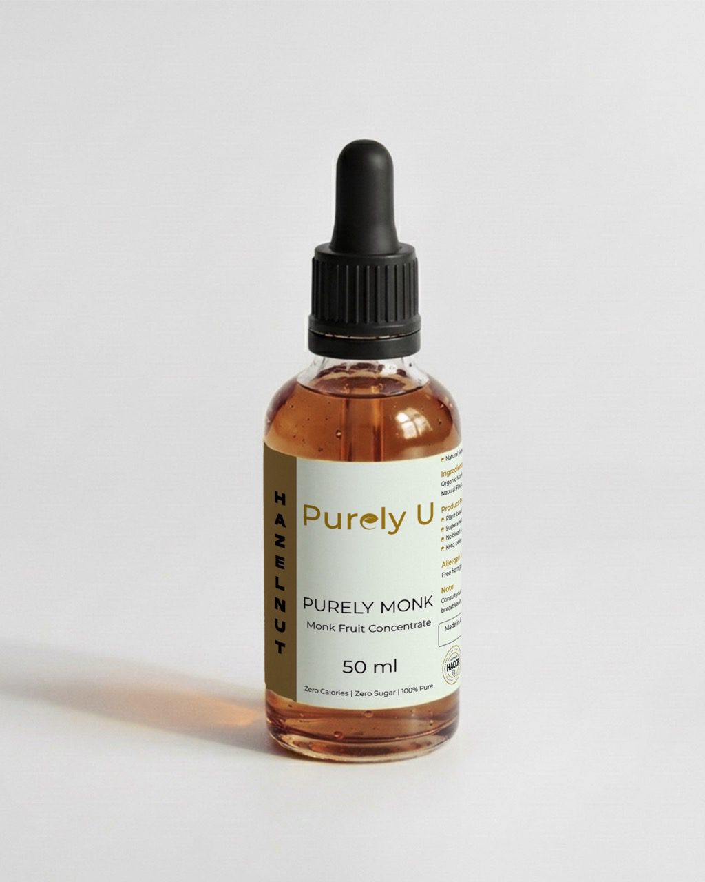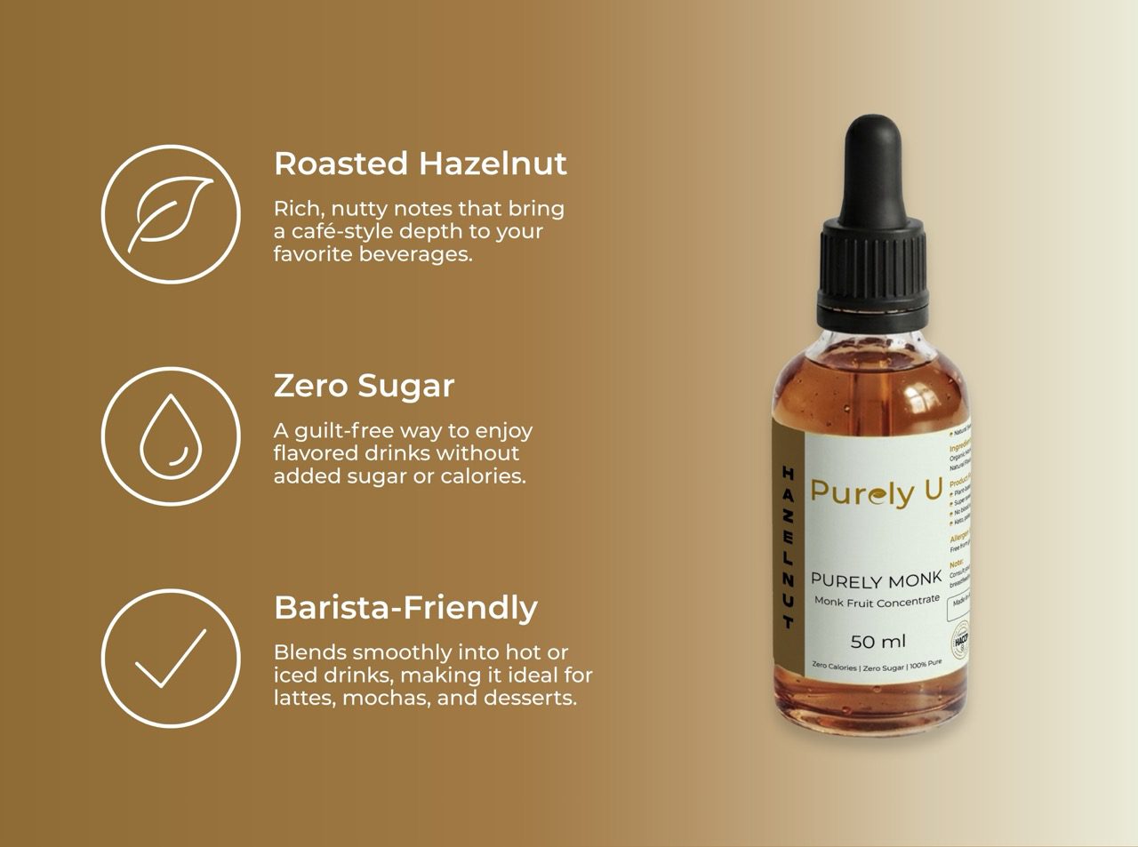 Blend 1 banana + 200mL almond milk + 1 scoop protein powder + 6-8 drops Purely U Hazelnut Monk Fruit. Enjoy a creamy, nutty boost.
