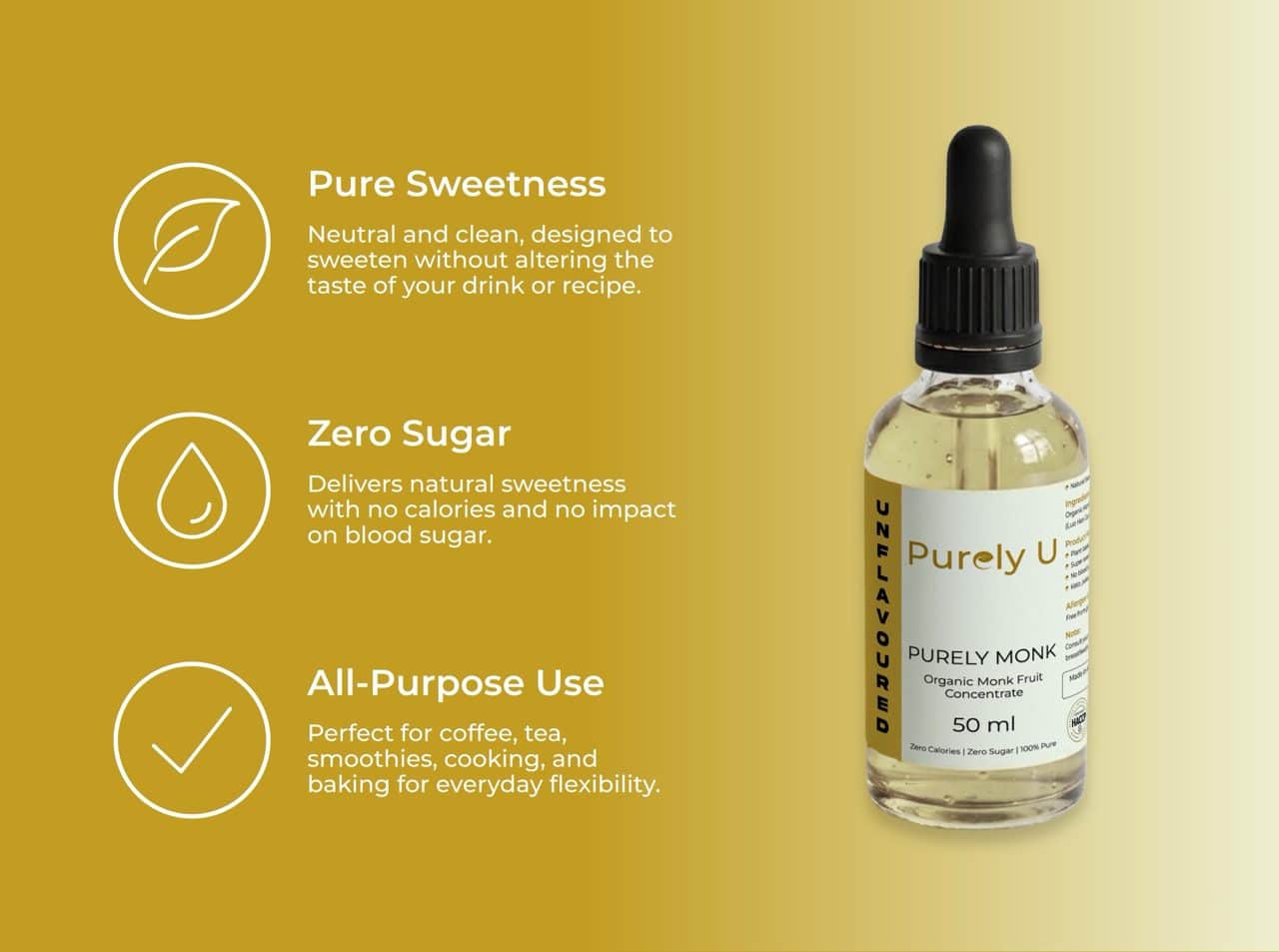 Experience certified organic sweetness on the go with Purely U’s compact 50ml Monk Fruit Drops. This portable powerhouse delivers the same premium certified organic quality as our 100ml bottle in a convenient travel size – perfect for your handbag, gym bag, office desk, or weekend adventures.